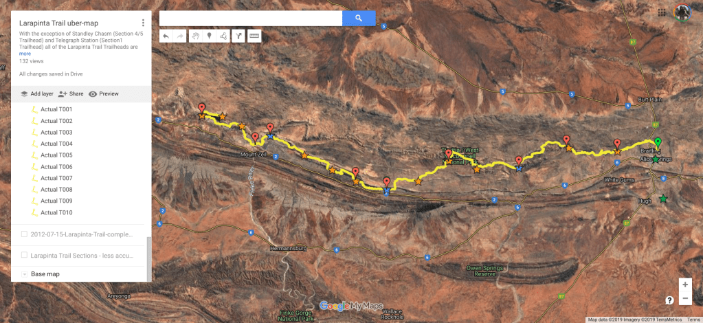 Larapinta Trail Map Written by Steve Dawson Reference map for the Larapinta Trail as walked in May 2018. click the map image to view the Google map Share this: Click to share on X (Opens in new window) X Click to share on Facebook (Opens in new window) Facebook Click to share on LinkedIn (Opens in new window) LinkedIn Click to email a link to a friend (Opens in new window) Email Like Loading... Leave a comment Cancel reply Δ