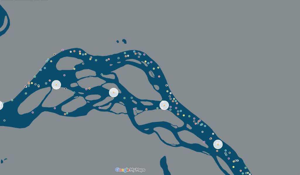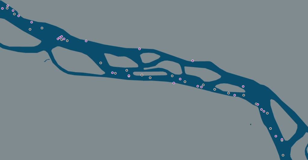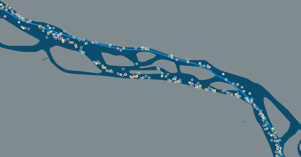 If we add the tracking points from a lot more boats, we can see some patterns start to emerge. There are now almost enough dots to step from location to location with some confidence. At the same time, we see more deviations. There are now several boats which have chosen river-right, and a couple that have popped up in the middle channels.