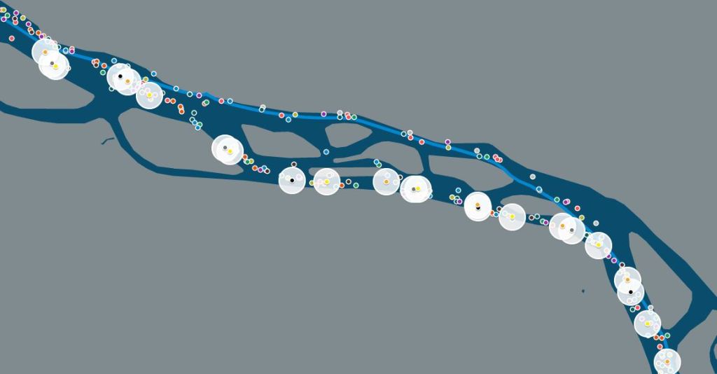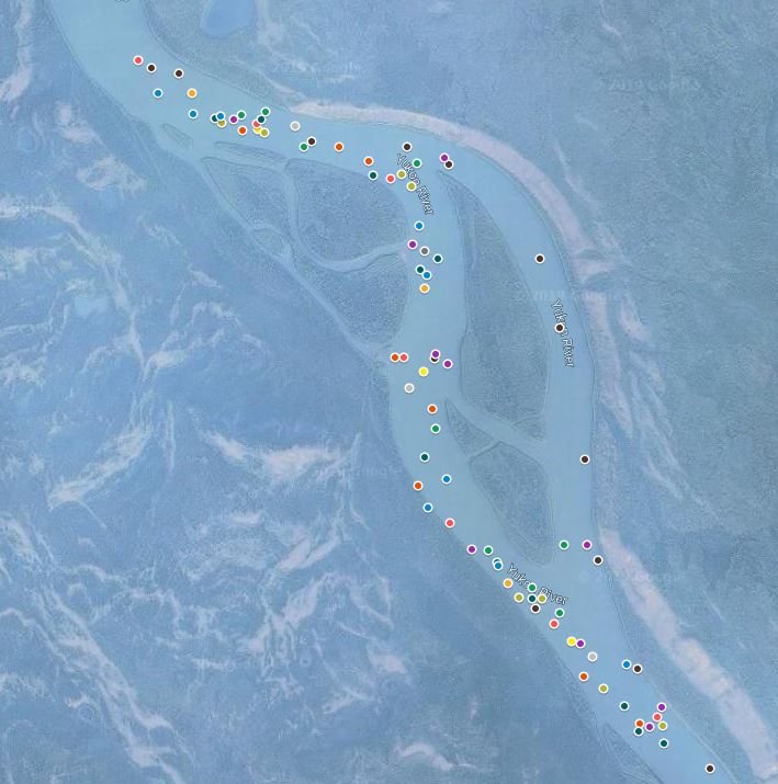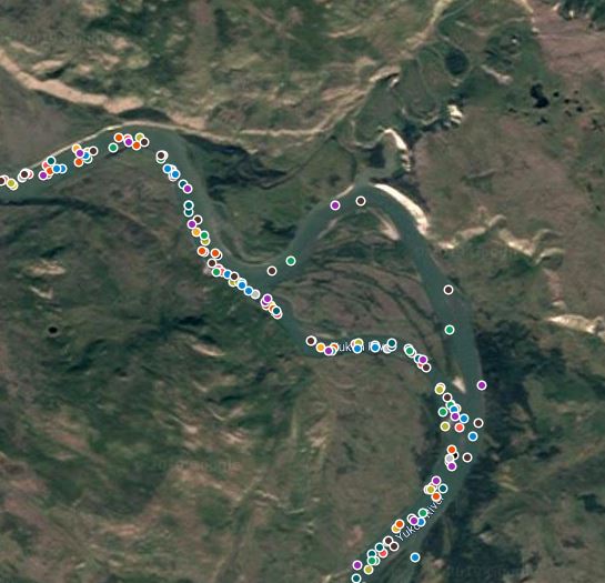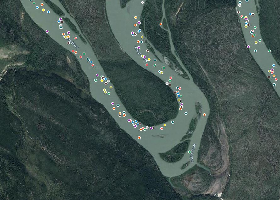 So with a little data magic we start painting the positions on the map. The map above shows four teams from the middle of the 2018 field entering a section of river somewhere past Carmacks. We can see that there are several checks from multiple boats in the river-left channel (lowest in the map), but there’s at least one boat that’s chosen to go river-right.