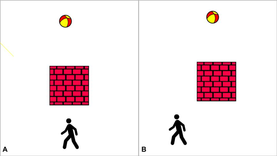 The foreground object obscures the target in A, but as the observer moves, the target comes into sight in B.