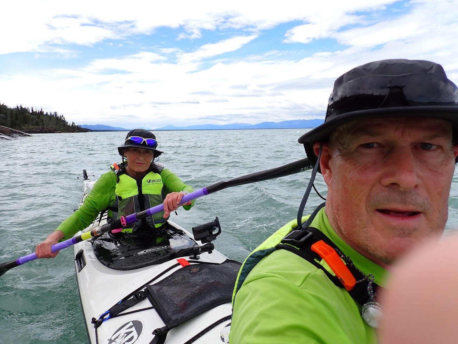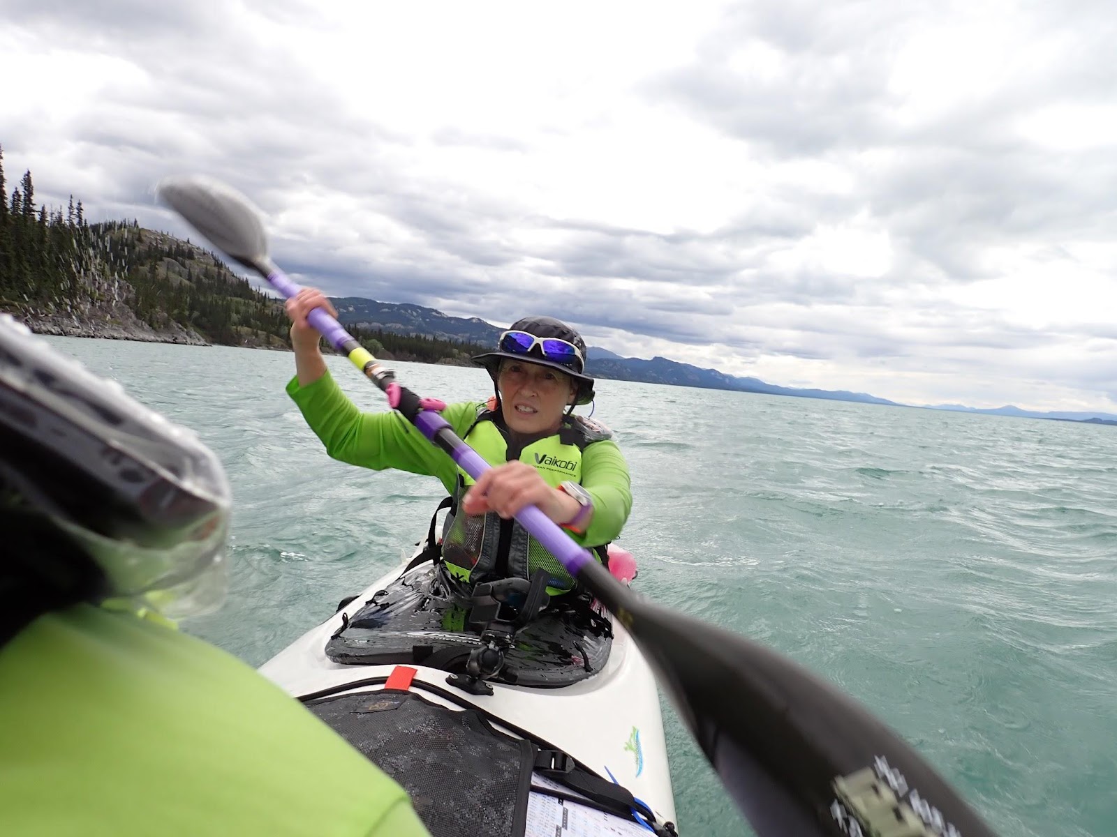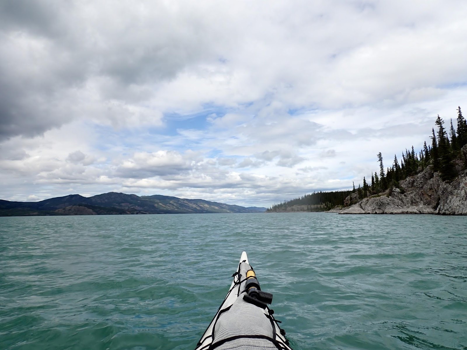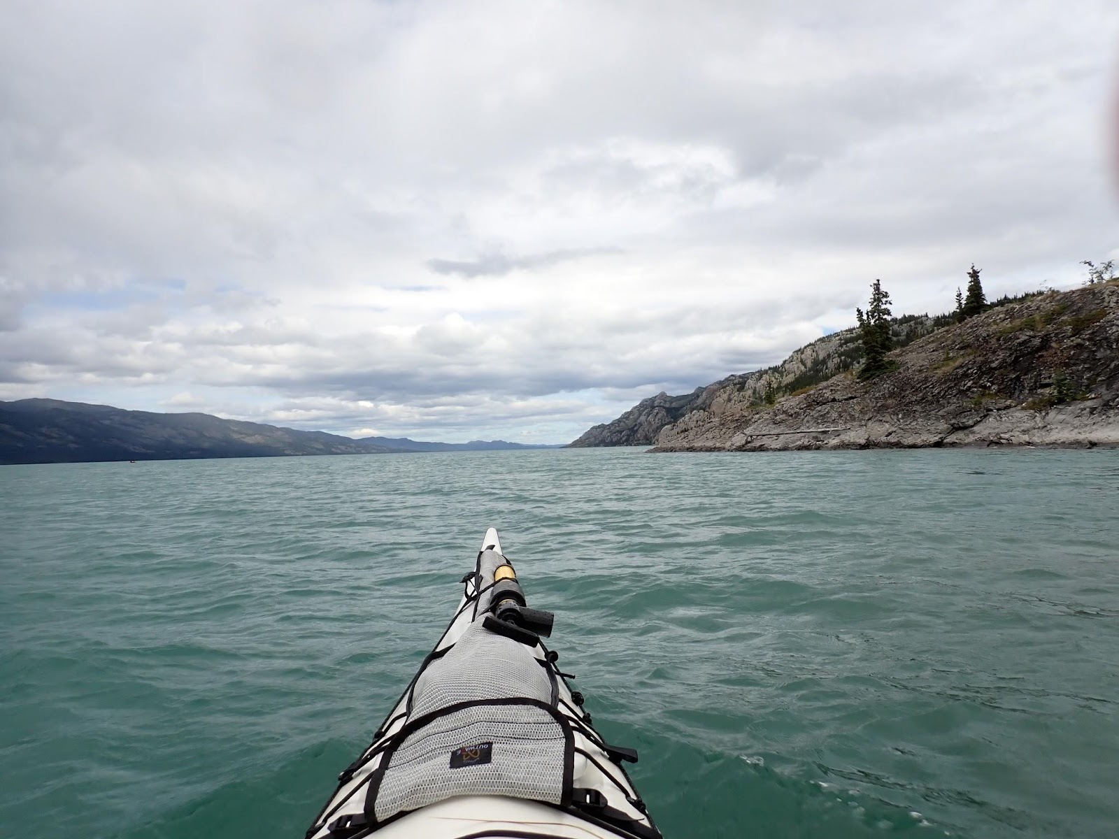 By the time we had the Lower Laberge exit in our sights the waves were about 2ft high and coming diagonally across from behind us. We had been watching the Brodersons out wide, knowing how much skill and nerve it takes to pilot a canoe in those conditions, they have our respect. The kayakers they’d been chasing had been forced to take a long line across the lake to bring them back to exit. That had put them in the middle of the lake for a long stretch at its most chaotic reach. We thought we recognised them as a pair of adventure racers who were quite new to paddling. Sometimes you may be better off not knowing.
