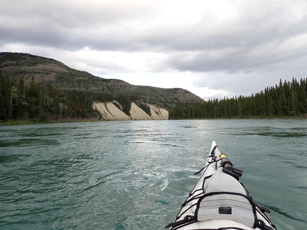 A few kilometres from the entrance to Laberge, we were among a loose collection of four other boats. There were the two Kiwi guys in a double kayak and a couple in a canoe we’d later identify as the Brodersons, a UK father-son pair in a kayak, and a couple of mates from the UK in another rounding out the teams we could see. Most of the teams were taking a traditional line around the outside of the bends, but one of the UK teams seemed to be following our shorter line.