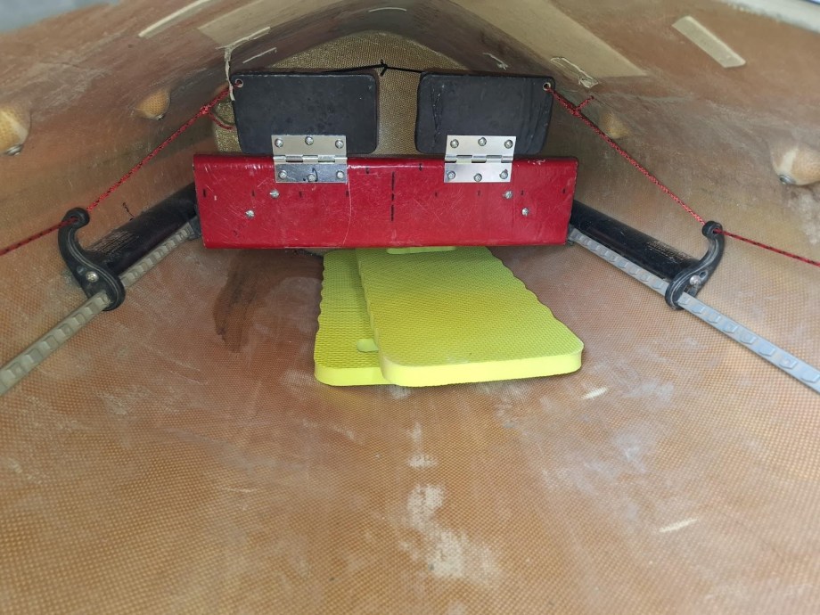 We launched ourselves into the boat upgrades like a formula one pit crew. I’d spent several weeks building a set of upgraded foot rests. A simple plate for Kate in the back and a plate with steering pedals for me in the front. The foot rests had been built from fibreglass and carbon fibre working from a couple of photos and some rough measurements I’d been sent when the boat went into storage. I’d built the plates with some extra length in them so I could trim them to size when we finally got hands on the boat.