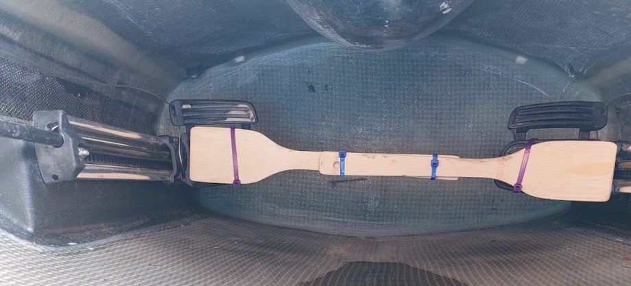The one small oversight with the rudder pedals was that I’d used light metal hinges and they were already deformed from turning the long double on the lake. They were still holding, but considering the consequences if they broke out on the river, we decided they needed to be upgraded. We’d left Wednesday as our day for test packing the boat and doing fine tuning, so we added a side trip to The Home Hardware Store for some upgraded hinges and some bolts to fix them in place. It was an added bonus that we’d be paddling on fresh water so we didn’t need to find stainless steel fittings like we would back home. A few hours and the steering system was finished. We had no more time for test paddling, so we would just have to trust that I’d built it well enough for 1000 miles. In 2023, I’d jury rigged a foot bar from a set of wooden salad serving forks and some zip ties. That contrivance had lasted 500km before needing new zip ties and then went the remaining 200km to Dawson.