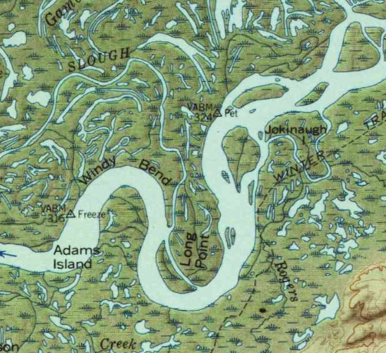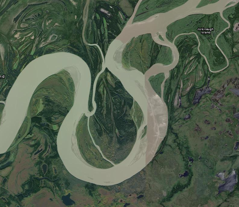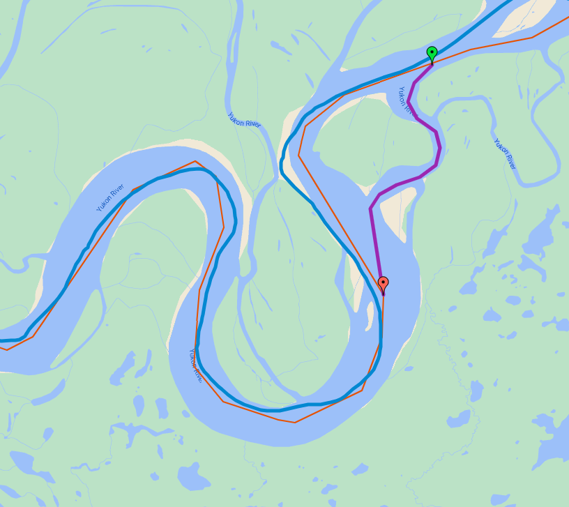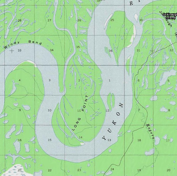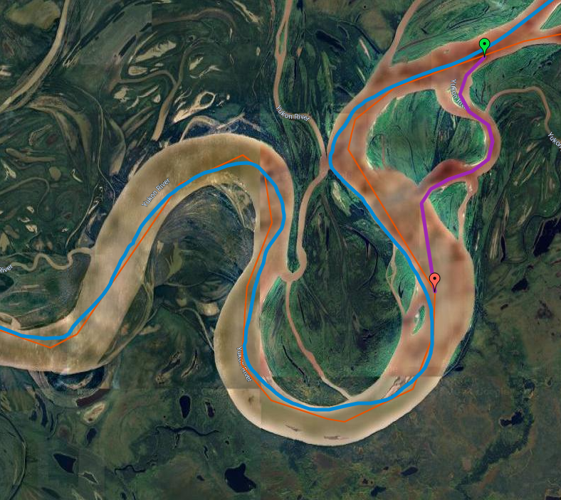 Long Point is typical of the mapping challenge of the yukon 1000. Most of the maps show there is no way through the cut. Satellite imagery is either from winter when the river is frozen white, or at unknown water levels which may not be relevant to the river in front of us.