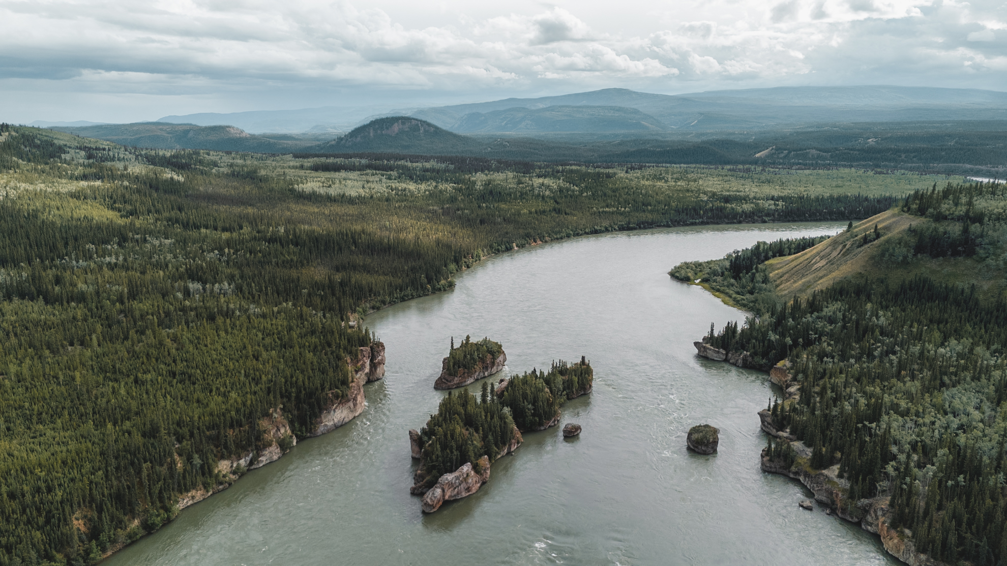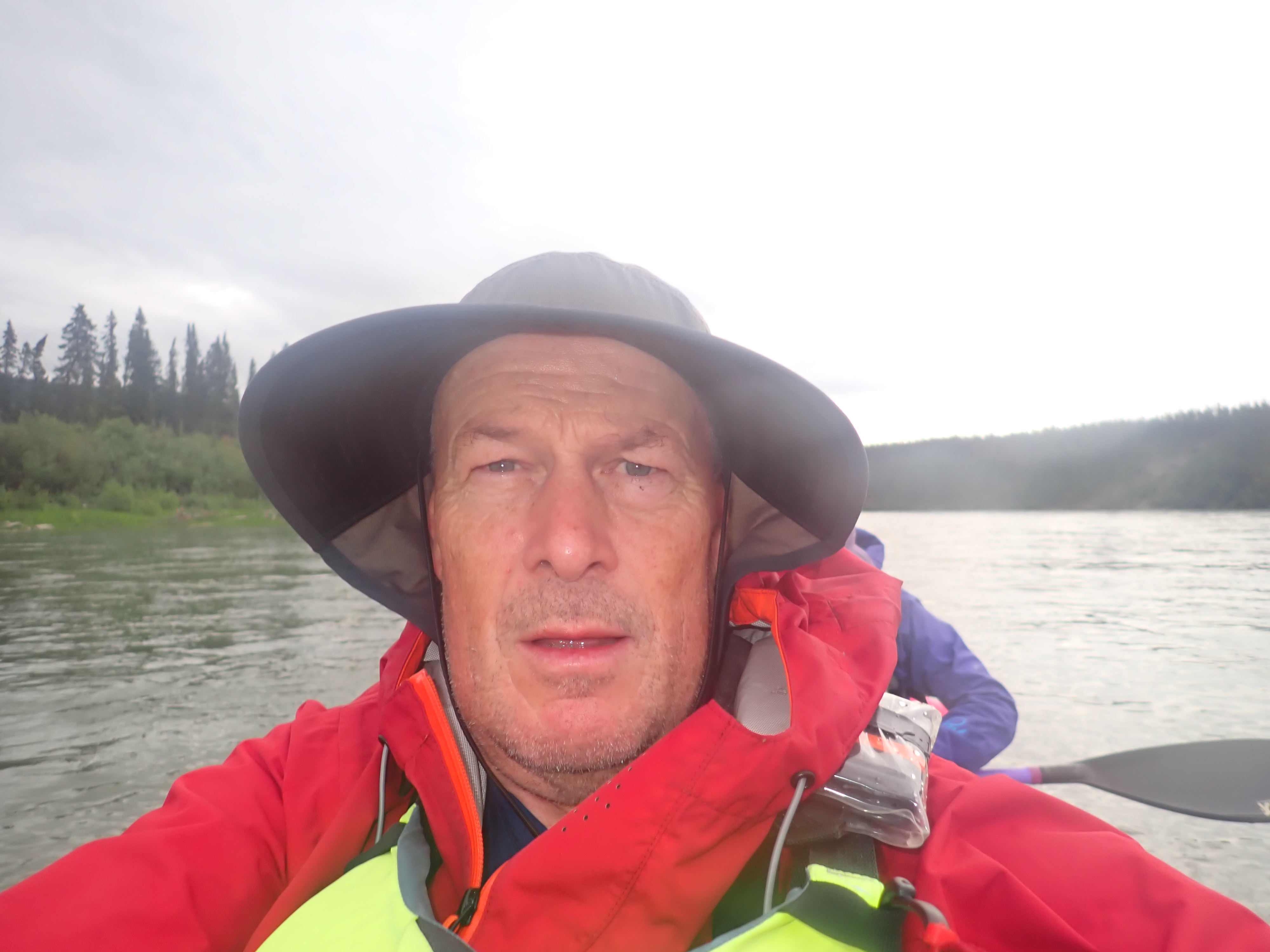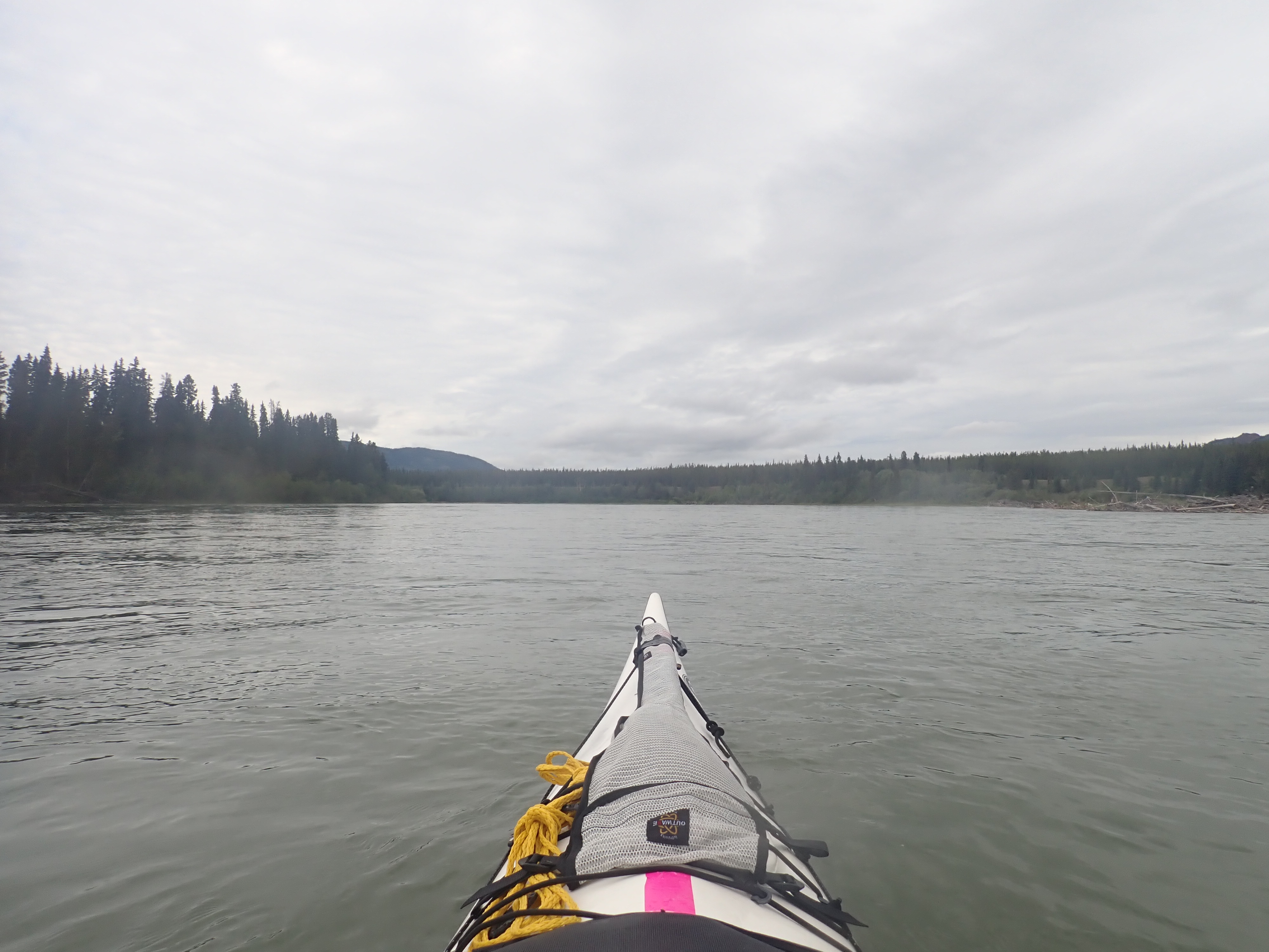 Although the rain had stopped overnight, the sun hadn’t risen enough to start warming the river. The startline at Whitehorse is already far enough North for there to be no darkness at night. We were now 200km north of there. By the time we reached Dawson in a day or so the sun would barely dip below the horizon at night. Closing in on Carmacks though, the rugged terrain on either side of the river banks blocks the early morning sun.