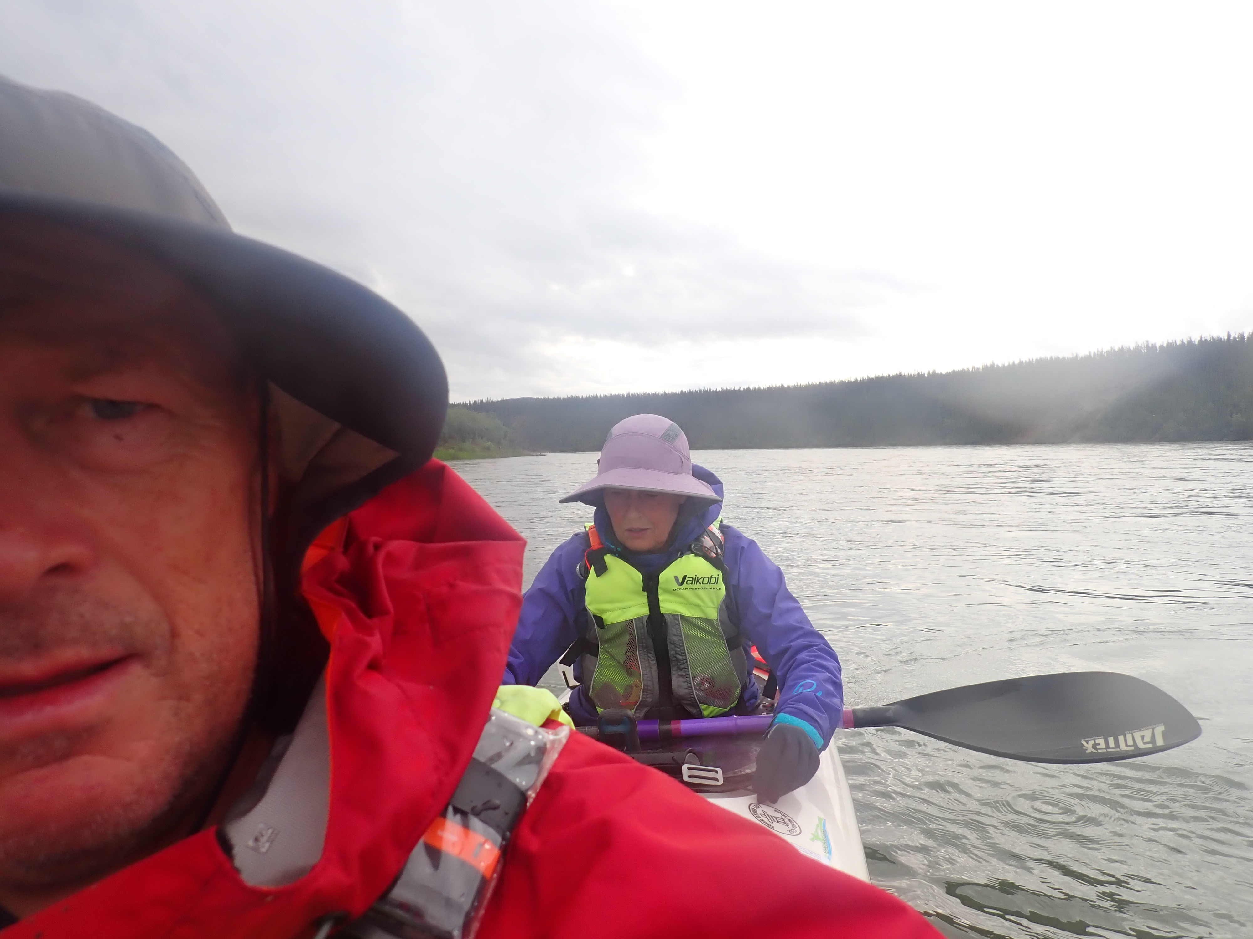 The Little Duckers (team 8) had slipped past us unnoticed some time early in the day, and we’d come up behind them again not long after Carmacks. Most of the time they were pushing their boat along quite effectively, good form, good sync, good cadence. But then they’d pause and we’d pass them again. They told us they’d had a rough time on the lake and all of their dry gear was wet, so they’d slept in wet gear the first night.