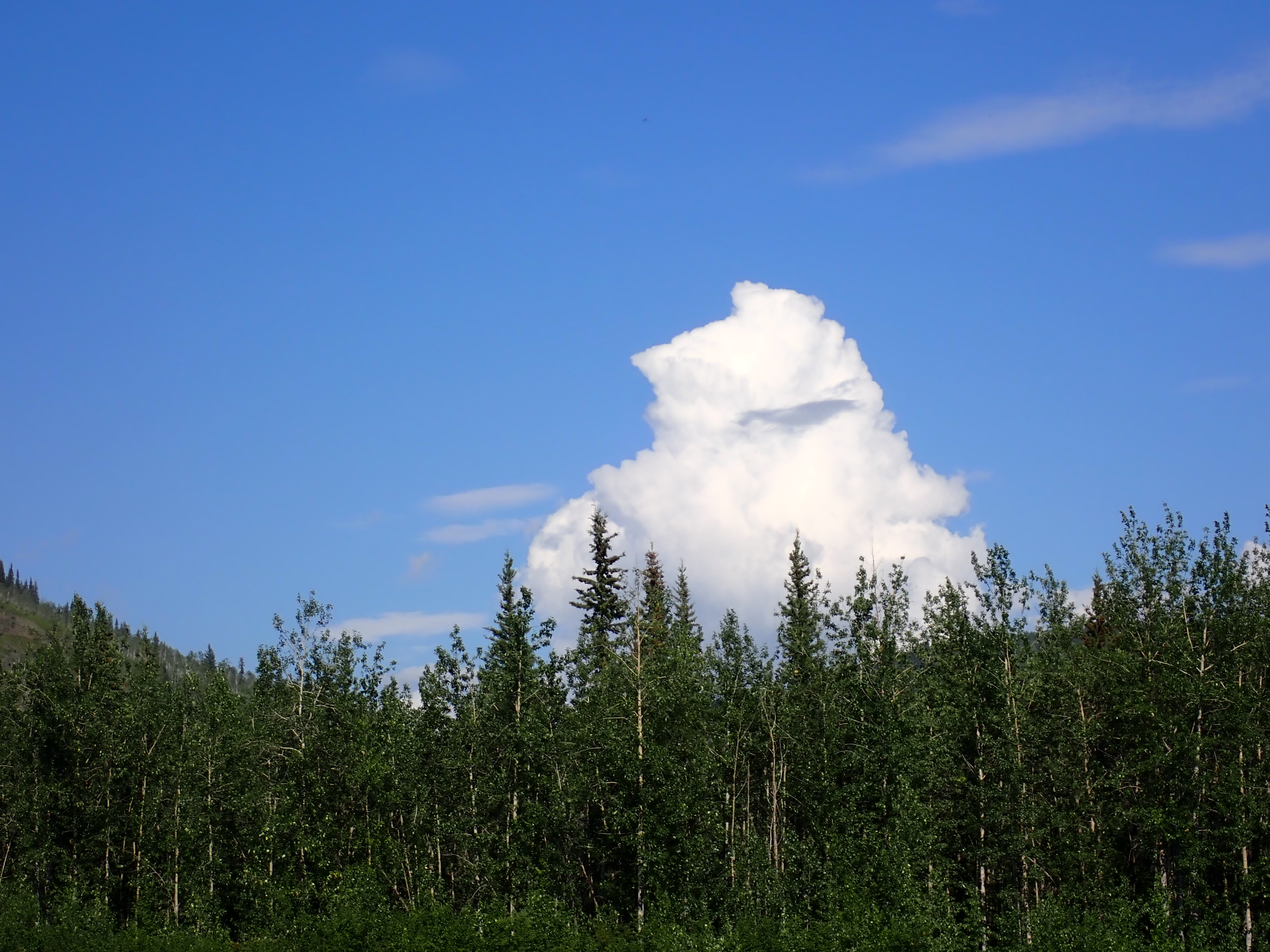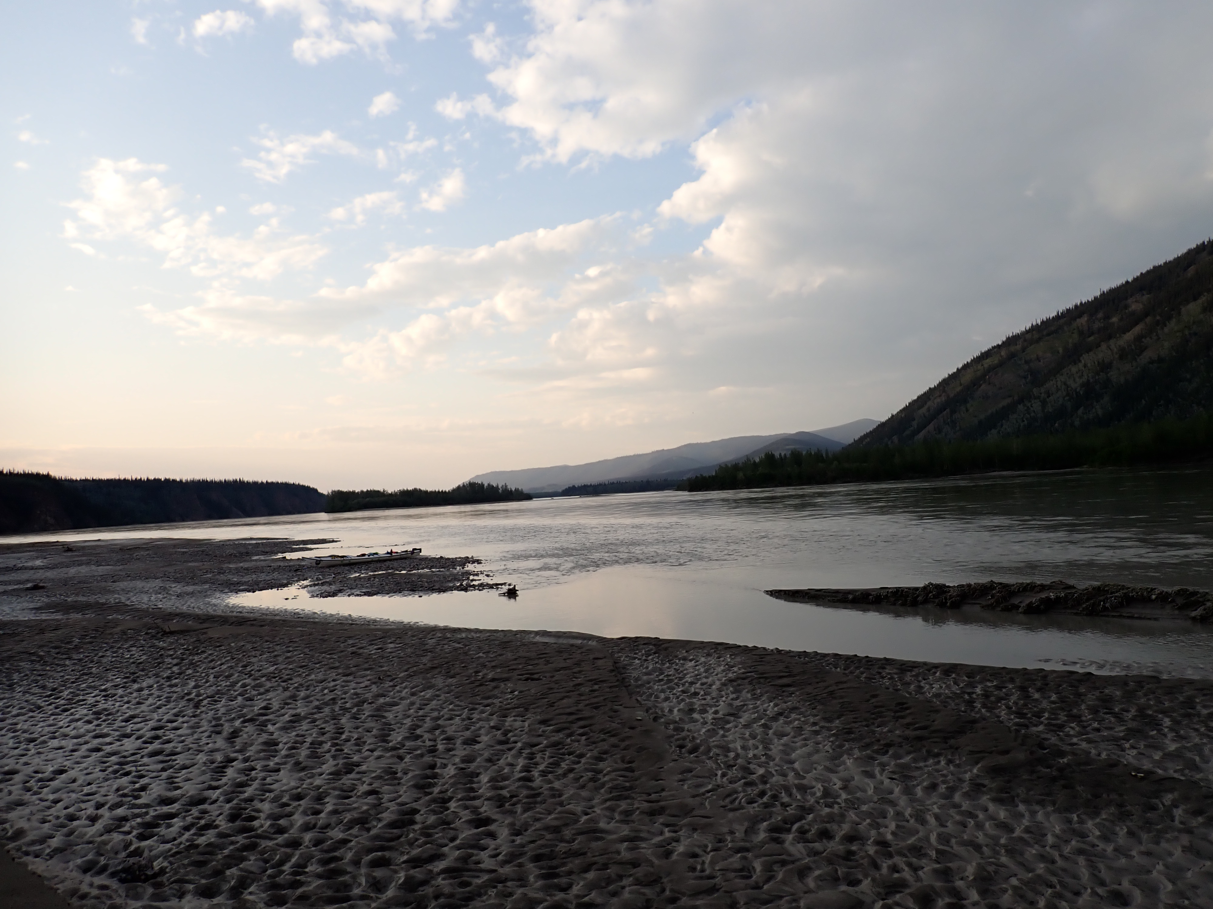 Now that we were paddling north we were seeing a large plume of smoke rising from behind the hilltops ahead. This was almost certainly from one of the two fires which were burning east and west of Dawson, threatening to cut off the road access to the residents of Dawson. As we paddled, we lined up the base of the plume with where we judged Dawson to be and tried to find any topology that would help us confirm the distance estimate. The fires in Dawson were well back from the river and didn’t pose any threat to paddlers. We wanted to convince ourselves that this wasn’t a fire on the riverbank between us and Dawson. It looked OK.