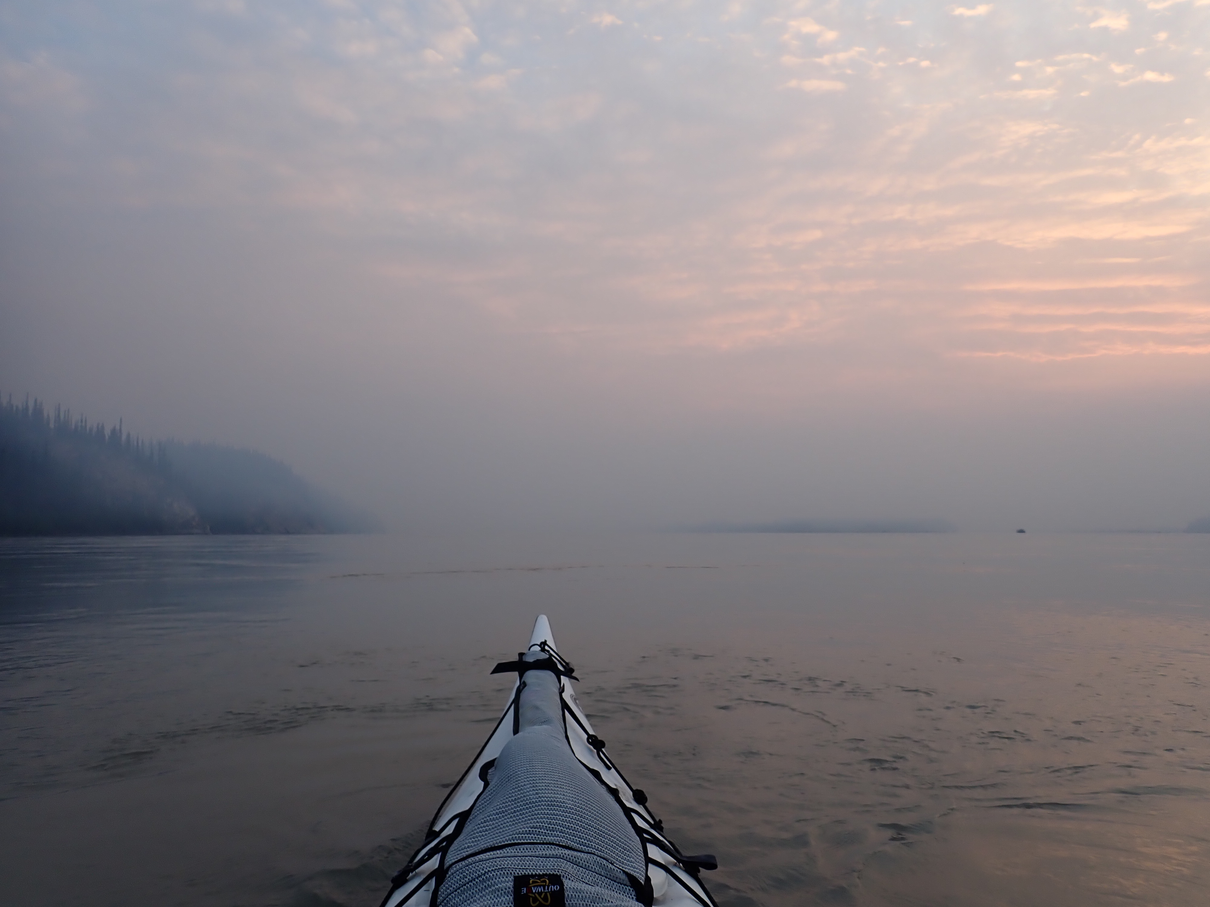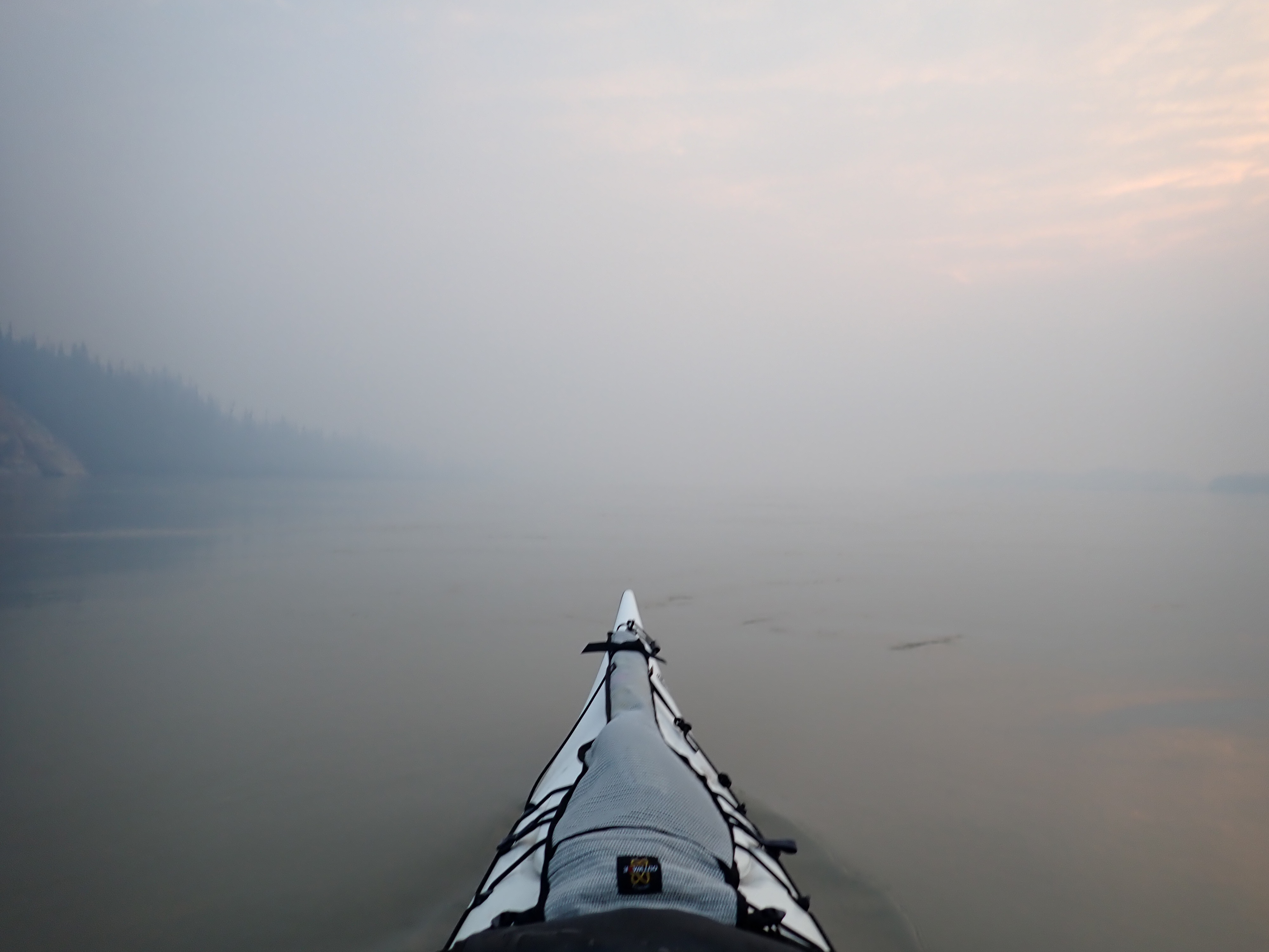 The smoke didn’t have the acrid burn I associate with fresh smoke, even though it was too thick to see through. That alleviated our initial concern – I’ve had bad reactions to wildfire smoke in the past, withdrawing in 2023. Our risk mitigation is to pack industrial quality masks. They’re good enough let me breathe freely, but paddling in a rubber mask is neither pleasant nor particularly efficient.