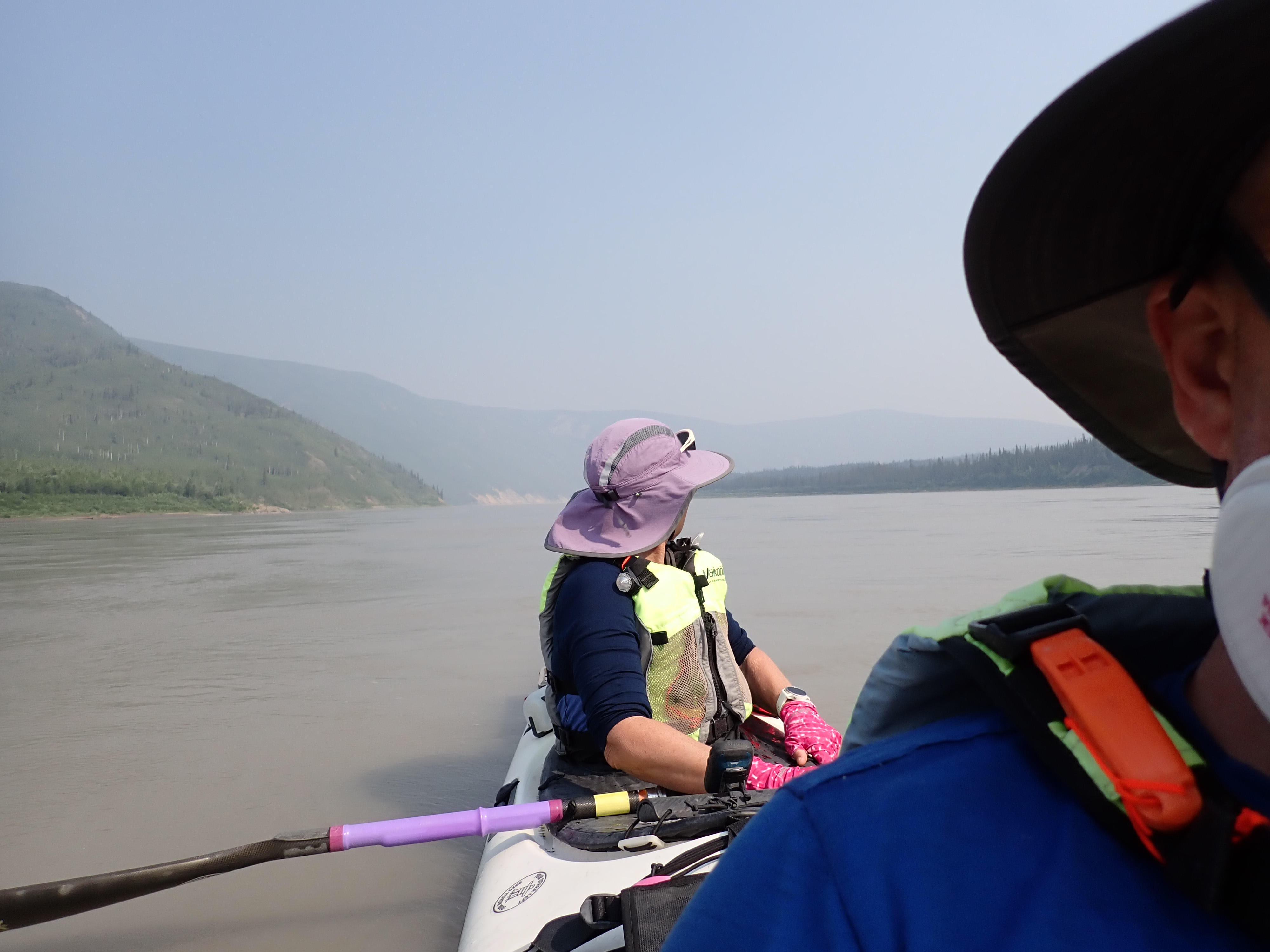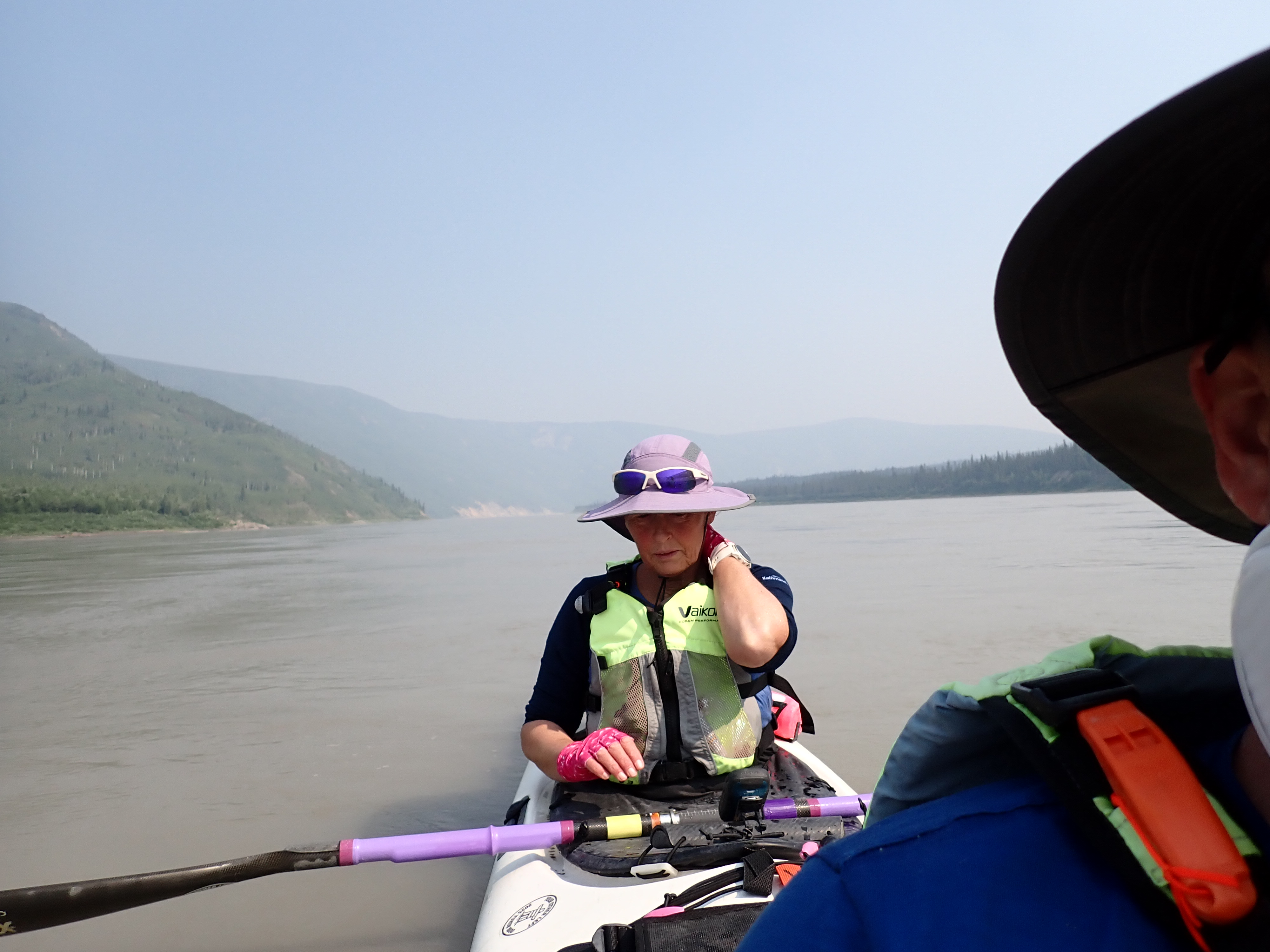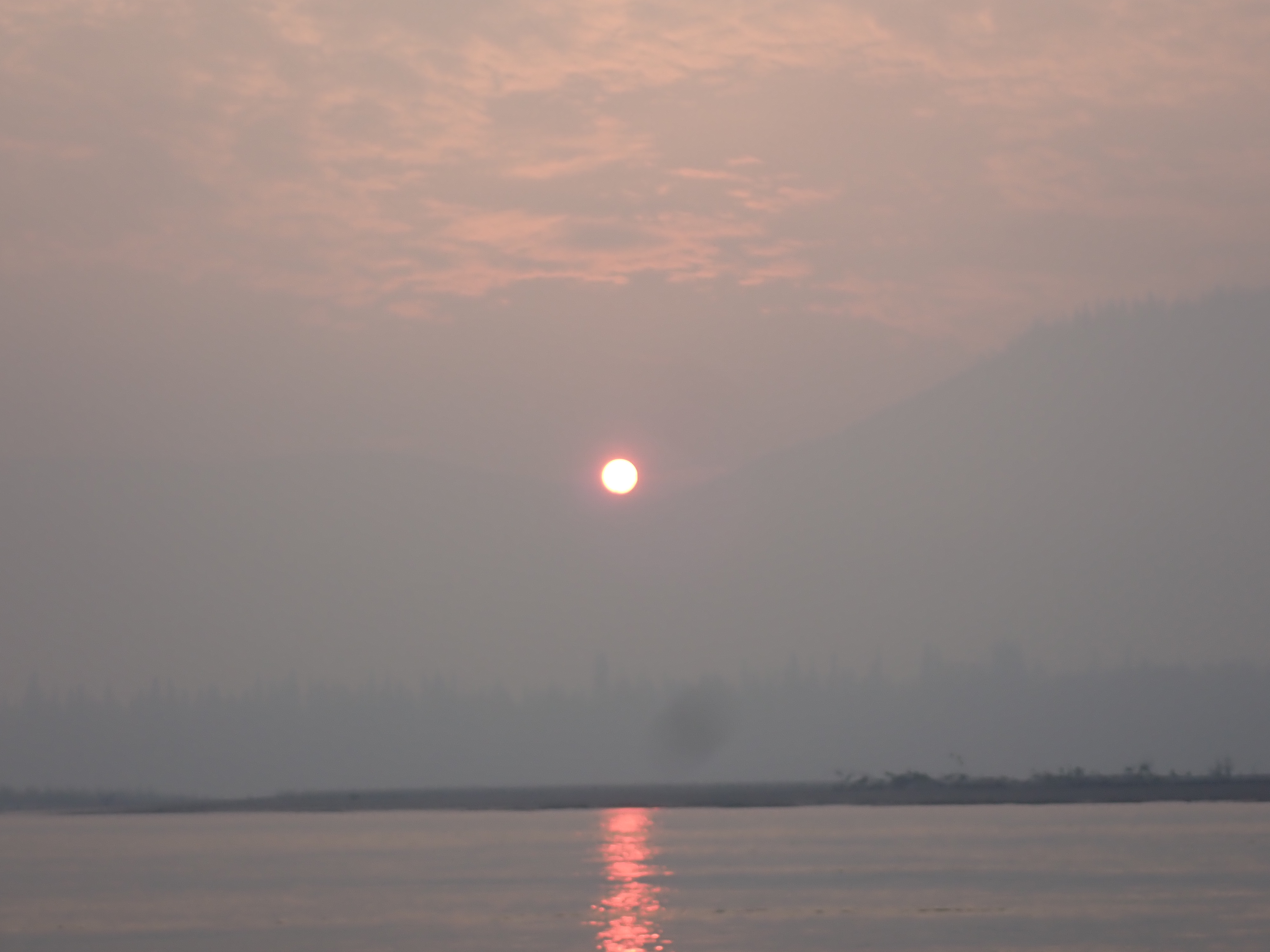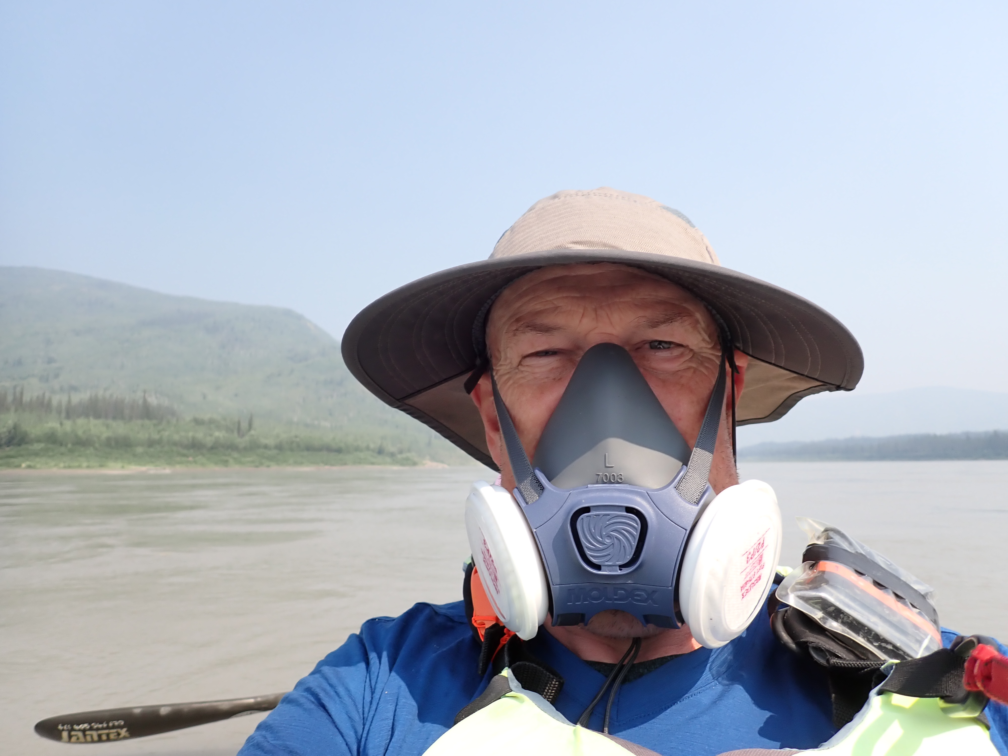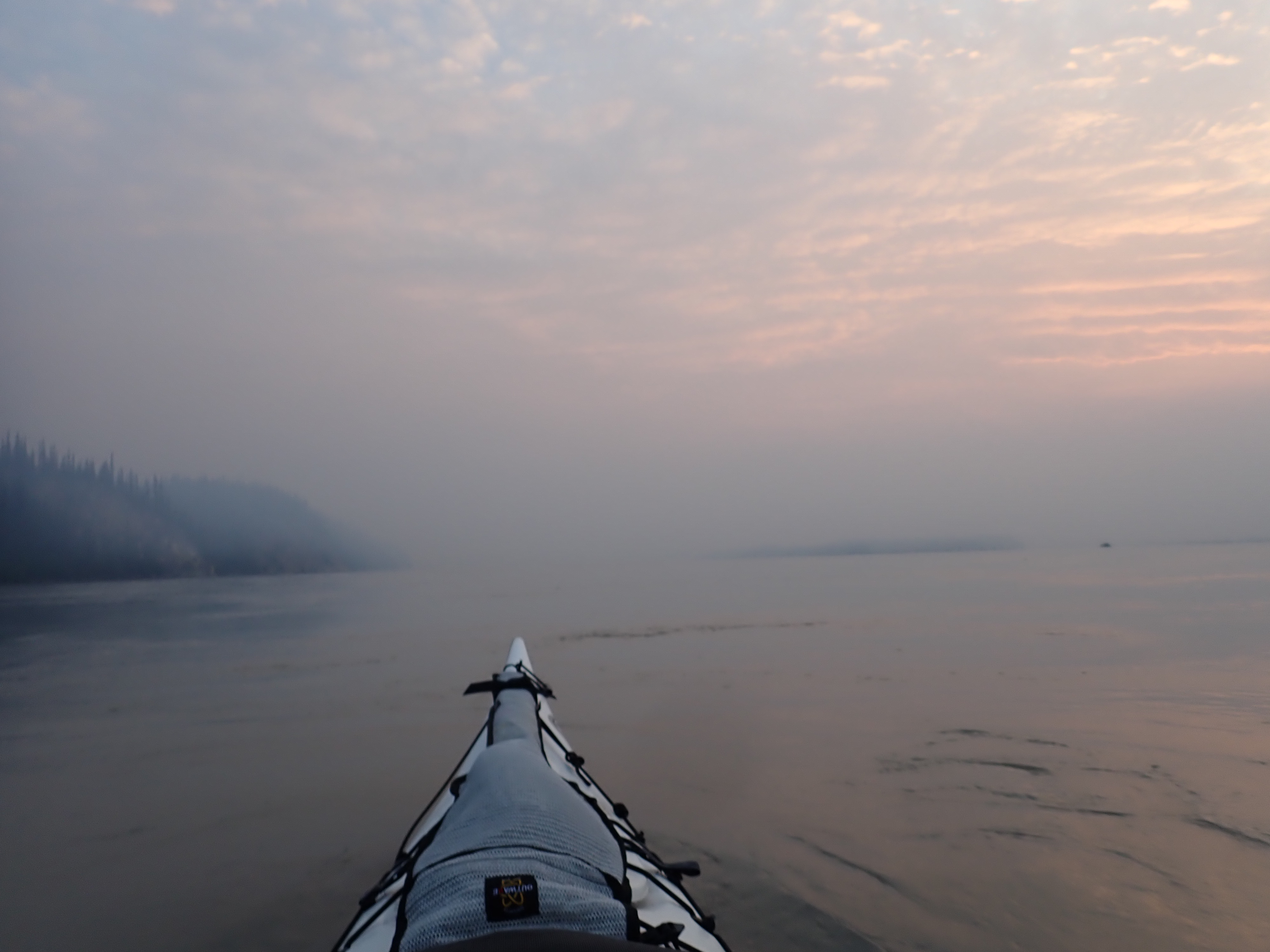 We soon encountered the smoke. It was sitting in the river valley and got progressively denser over the next three or four hours. Unlike the morning smoke, this was fresh enough for me to dig out my smoke mask. We spent maybe four hours paddling in smoke, expecting to finallt find the source