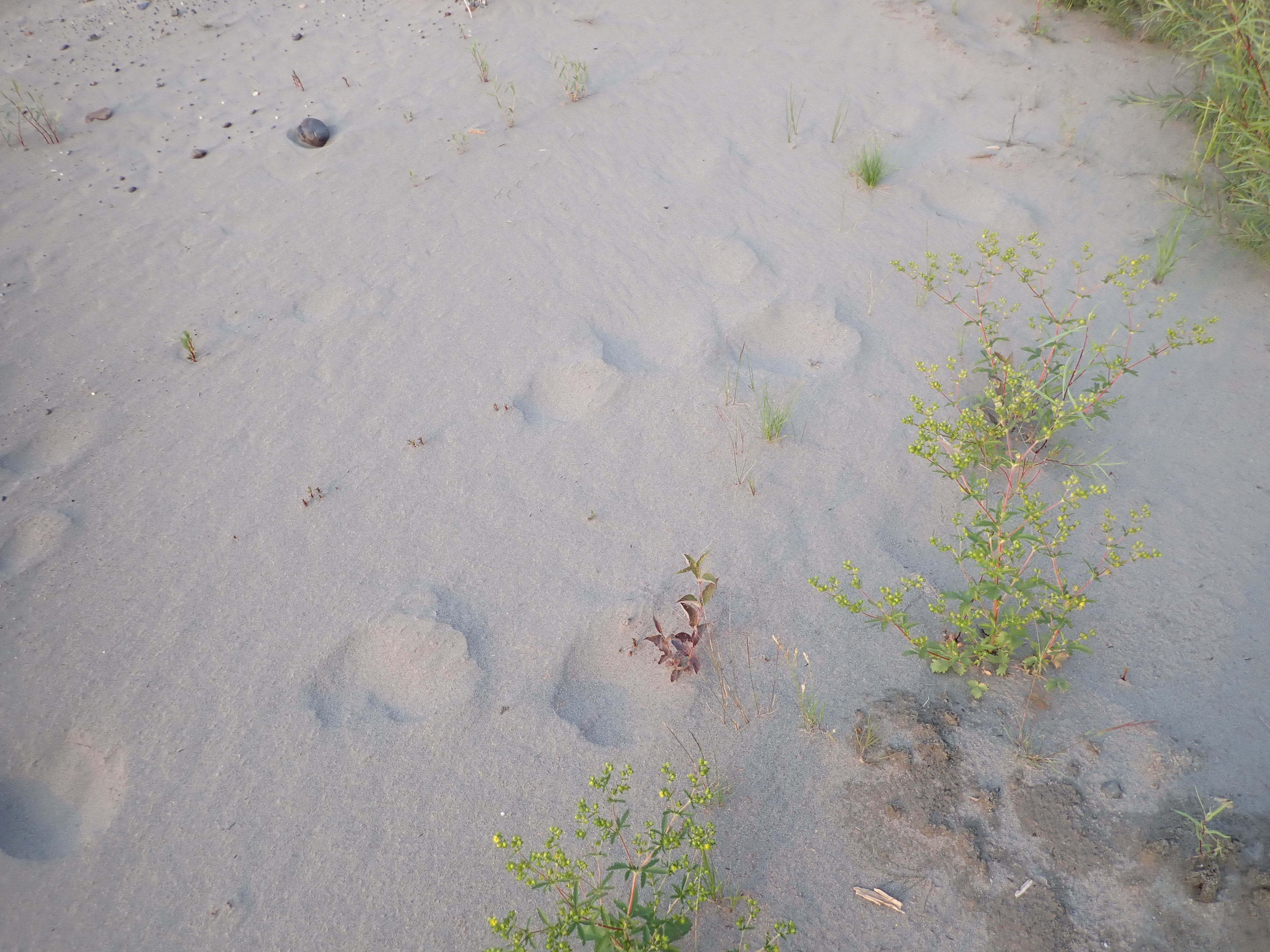 Moose are, I think, an underrated risk on the 1000. They are very large, potentially defensive around young, and capable of doing a person some serious harm. Advice for dealing with a charging moose is to get behind a tree or similar protective barrier. As we’d chosen our campsite for its lack of trees, we were poorly positioned for a moose encounter. When we noticed that the moose prints seemed to be two distinctly different sizes, our concern expanded to include a mother with a calf. The tracks in the sand were fresh and well defined, but starting to decay. Probably a day or two old.