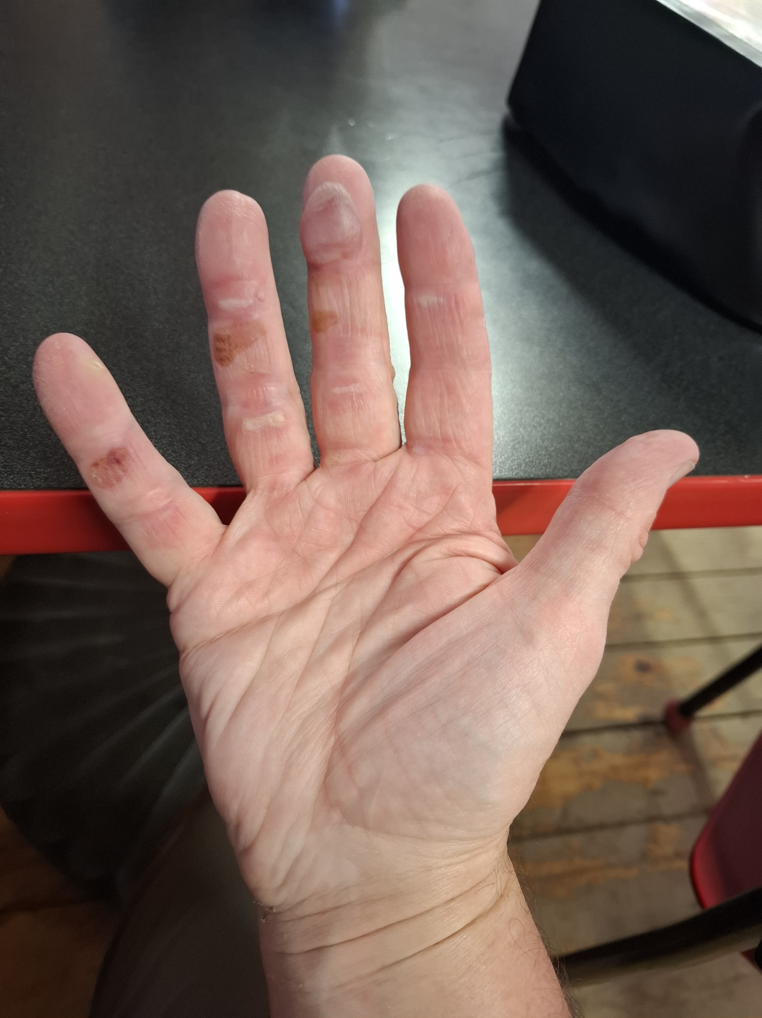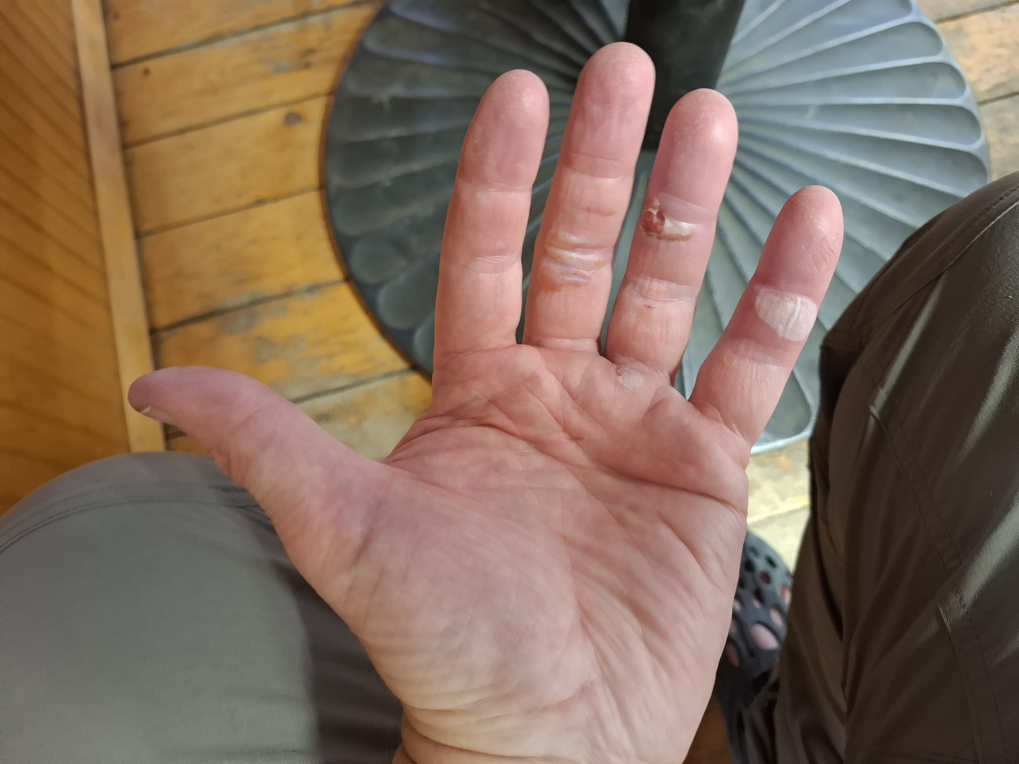 - Cohesive tape: I bought a new blister management approach for 2025. Cohesive tape is an elastic tape that only sticks to itself. It doesn’t stick to skin, hair or anything else. You can apply it to wet hands and it works well to reduce friction and protect hot spots. I would put it on the load-bearing joints of my fingers in the morning and take it off completely at night, which allowed my hands to dry out.
